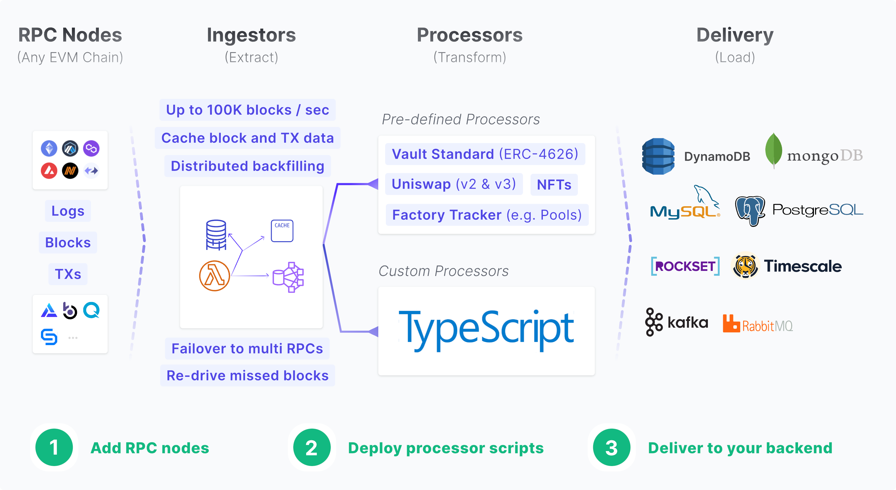 - 🧩 Focused on primitives, which means on the left you plug in an RPC and on the right you output the data to any destination database.